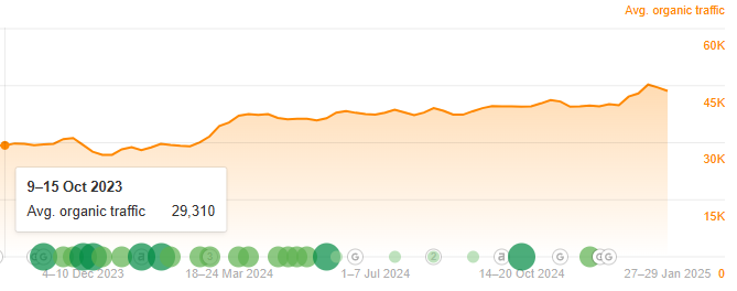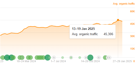 Over 27 months, we built 375 live backlinks, raising DR from 70 to 71 and boosting traffic from 29k to 45k per month—a 54.5% increase. Keywords jumped from 135k to 230k, helping the client rank for competitive terms like “Spanish classes” and “language school.”